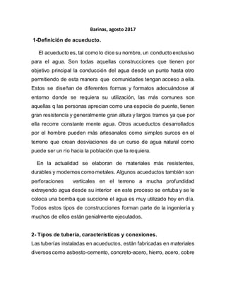 El documento describe diferentes tipos de acueductos y sus características. Explica que los acueductos son estructuras para conducir agua desde un punto hasta otro. Luego describe varios tipos de tuberías comúnmente usadas en acueductos como PVC, hierro dúctil, pead, acero galvanizado, acero inoxidable y cobre. Finalmente, define los componentes de un sistema fijo de extinción de incendios con agua.