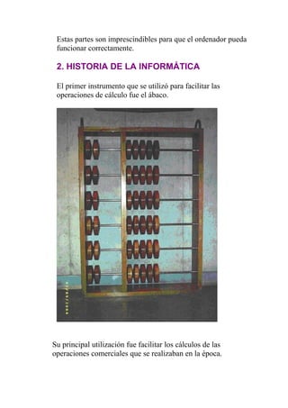 La informática se refiere al tratamiento automático de la información por medio de ordenadores. El tratamiento de datos implica tres fases: entrada, proceso y salida. Los sistemas informáticos tienen dos componentes: el hardware físico y el software de programas. La historia de la informática comenzó con máquinas mecánicas para cálculos y evolucionó a través de cinco generaciones de ordenadores, desde las primeras máquinas basadas en válvulas hasta los ordenadores personales modernos.