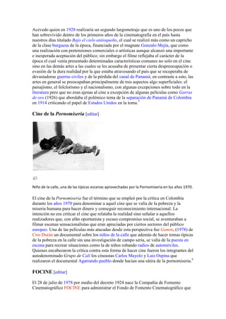 La historia del cine en Colombia comenzó en 1897 con la llegada del cinematógrafo. Las primeras producciones se limitaban a capturar paisajes y momentos de la vida nacional hasta 1922 cuando se realizó el primer largometraje de ficción llamado "María". En la década de 1920 surgieron los primeros estudios cinematográficos como Acevedo e Hijos. En 1978 se creó FOCINE para apoyar la producción nacional aunque fue liquidada en 1993. La Ley de Cine de 2003 ha permitido un renacimiento de la industria cinematogr