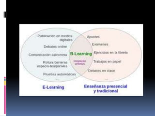 El documento define el e-learning como la entrega de material educativo a través de medios electrónicos como Internet, redes, audio y video. Explica que el e-learning permite el aprendizaje flexible en cualquier lugar y momento. También describe el b-learning como un modelo híbrido que combina la enseñanza presencial con recursos en línea. Finalmente, identifica algunas ventajas del e-learning y b-learning como mayor accesibilidad de materiales y colaboración, pero también señala posibles desventajas como la dependencia tecnológ