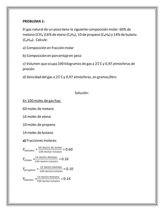 El documento presenta 5 problemas de balance de materia y energía para procesos de separación. El primer problema involucra el cálculo de la composición molar y porcentaje de peso de los componentes de un gas natural. El segundo problema determina el flujo de alimentación y evaporación de agua necesarios para concentrar una solución de sosa. El tercer problema calcula la cantidad de solución requerida y gases tratados para producir una corriente de SO2 al 20%. Los problemas 4 y 5 involucran balances para obtener sales a partir del agua de mar y determinar la evaporación de