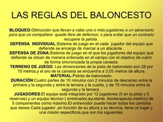 El documento resume las principales reglas y conceptos básicos del baloncesto. Explica que el baloncesto se juega en una cancha de 28x15 metros con un aro a 3.05 metros de altura. Los equipos tienen 5 jugadores cada uno y el partido dura 4 cuartos de 10 minutos cada uno. Se anotan puntos de diferentes valores dependiendo de la distancia a canasta. También describe las diferentes posiciones de los jugadores, faltas, sistemas defensivos y acciones de ataque y defensa.