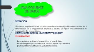 Este documento proporciona una introducción a la programación orientada a objetos en Java. Explica que este paradigma permite crear sistemas bien estructurados mediante objetos que representan componentes del sistema. Luego describe los objetos Connection, Statement y ResultSet que se utilizan para interactuar con bases de datos, y cómo establecer una conexión a una base de datos SQL Server y ejecutar consultas SQL para recuperar y mostrar datos.
