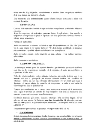 Este documento describe el uso de microondas en fisioterapia. Explica que las microondas generan calor en tejidos más profundos de forma regulable y están contraindicadas en personas con prótesis o embarazadas. Se aplican durante 7-15 minutos provocando una sensación agradable de calor para ayudar en la recuperación de lesiones. Sus contraindicaciones impiden el uso en personas con implantes metálicos, marcapasos, prótesis, zonas genitales, neoplasias, heridas o falta de sensibilidad.