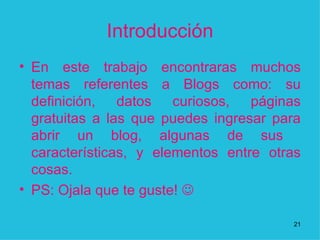 Introducción En estetrabajo encontraras muchos temas referentes a Blogs como: su definición, datos curiosos, páginas gratuitas a las que puedes ingresar para abrir un blog, algunas de sus características, y elementos entre otras cosas. PS: Ojala que te guste! 1