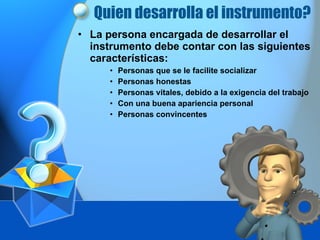 El documento describe las diferentes etapas de la investigación de mercados, incluyendo el desarrollo del instrumento de recolección de datos, la capacitación de quienes lo aplican, los métodos de análisis de datos como el ANOVA y la correlación, y la tabulación e informe final de los resultados.