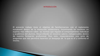 El documento resume el reglamento estudiantil de una institución universitaria. Explica que el reglamento es un conjunto de normas que rigen el comportamiento de los estudiantes y que fomenta valores como la reflexión, la convivencia ordenada y el desarrollo profesional. Detalla algunas ventajas como conocer derechos y deberes, y no tiene desventajas. También cubre temas como traslados, fraude académico, sanciones y derechos de los estudiantes. Resalta que el reglamento es necesario para mant