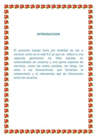 Este documento describe las herramientas de la Web 2.0, incluyendo blogs, wikis y redes sociales. Explica que la Web 2.0 fomenta la colaboración y el intercambio de información entre usuarios a través de comunidades. También compara las características de la Web 1.0 y la Web 2.0, y describe cómo las aplicaciones de la Web 2.0 permiten que los usuarios creen, compartan y busquen contenido de forma dinámica y colaborativa.