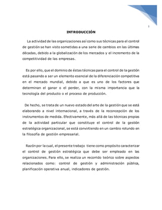 1) El documento describe varios indicadores de gestión que pueden usarse para medir el desempeño financiero y operativo de una organización, incluyendo indicadores de liquidez, eficiencia, endeudamiento, rentabilidad y valor para el cliente. 2) Explica conceptos como control de gestión, planeación estratégica, y métodos para evaluar proyectos de inversión como la tasa interna de retorno y el valor actual neto. 3) El control de gestión es fundamental para que una organización alcance sus objetivos y sea competitiva en el mercado.