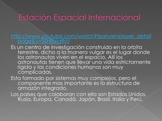 La Estación Espacial Internacional es un centro de investigación construido en la órbita terrestre donde los astronautas viven y trabajan en condiciones estrictas con poco espacio y falta de gravedad. Está formada por módulos de vivienda, laboratorios, paneles solares y vehículos de retorno, y es apoyada por agencias espaciales de Estados Unidos, Rusia, Europa y otros países.