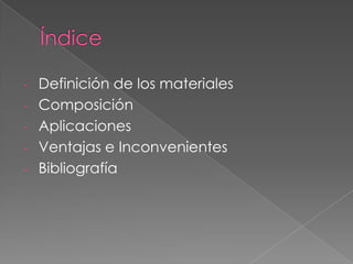 El documento describe diferentes tipos de polímeros y materiales compuestos, incluyendo su composición, propiedades y aplicaciones. Explica que los polímeros son macromoléculas formadas por la unión de monómeros pequeños y que los materiales compuestos se forman al unir dos materiales para combinar sus propiedades. Luego discute específicamente el policloruro de vinilo, poliestireno, sus características y usos comunes.