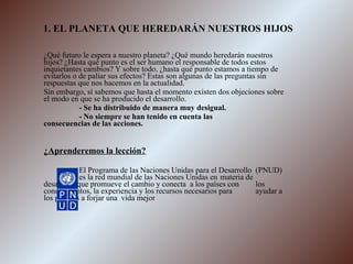 El documento discute la necesidad de un desarrollo sostenible para proteger el planeta y el futuro de las generaciones venideras. Explica que el desarrollo actual ha sido desigual y no siempre ha considerado las consecuencias ambientales. También describe algunas amenazas como la explosión demográfica, la desertización, la contaminación, la pérdida de biodiversidad y el consumo excesivo de recursos.