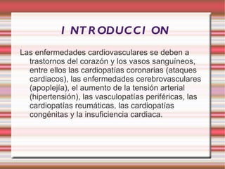 Este documento describe las principales enfermedades cardiovasculares, incluidas la angina de pecho, el infarto, las enfermedades coronarias, las arritmias y la insuficiencia cardíaca. Explica que factores de riesgo como el tabaquismo, la falta de actividad física y una dieta poco saludable son las principales causas de enfermedad vascular. Además, señala que aunque los medicamentos pueden reducir algunos factores de riesgo, no siempre tienen un impacto a largo plazo y que el trat
