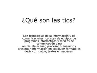 Las TIC son tecnologías como equipos, programas y medios de comunicación que permiten reunir, almacenar, procesar y presentar información en cualquier formato. Se clasifican en hardware, software, bases de datos y redes. Herramientas colaborativas como Google Docs permiten trabajar en grupo en línea compartiendo documentos. Los blogs y SlideShare permiten publicar y compartir contenidos en línea.