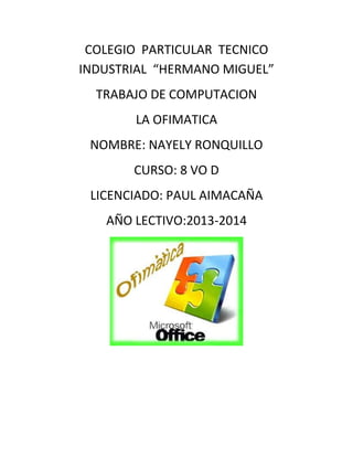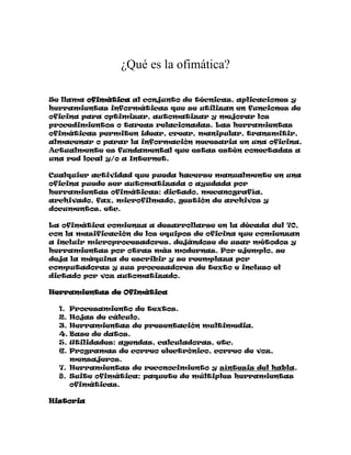 Este documento describe la ofimática, que incluye conjuntos de aplicaciones informáticas utilizadas para automatizar tareas de oficina como procesamiento de textos, hojas de cálculo, presentaciones y bases de datos. Explica que la ofimática comenzó a desarrollarse en la década de 1970 con la introducción de computadoras de escritorio y ha evolucionado para incluir aplicaciones en línea y suites ofimáticas como Microsoft Office y OpenOffice.