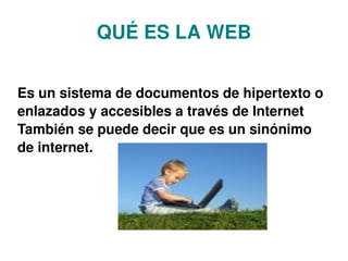 El documento describe brevemente la evolución de la web. Define la Web 1.0 como la forma más básica con navegadores de sólo texto. Explica que la Web 2.0 transicionó hacia aplicaciones enfocadas al usuario final. Además, señala que la Web 3.0 describe la evolución de la interacción en la red a través de diferentes caminos, mientras que la Web 4.0 representa un gran paso en la evolución de la telaraña mundial.