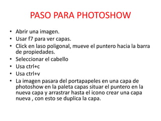 Este documento proporciona instrucciones paso a paso para modificar el color del cabello en una foto usando Photoshop. Los pasos incluyen seleccionar el cabello usando el lazo poligonal, copiar y duplicar la capa, y luego aplicar variaciones de color a cada capa para lograr el color deseado.