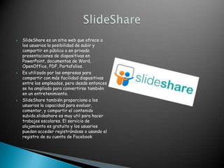 SlideShare, los slideshows y Scribd permiten compartir presentaciones de diapositivas y otros documentos en línea. SlideShare y Scribd permiten a los usuarios subir, ver y comentar presentaciones, mientras que los slideshows muestran automáticamente diapositivas en un orden determinado.