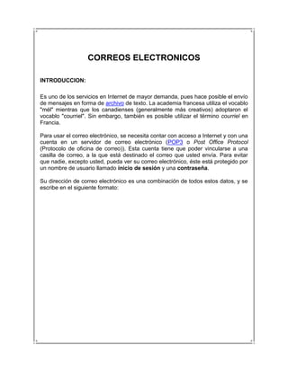 Este documento proporciona información sobre varios servicios de correo electrónico populares como Gmail, Hotmail y Yahoo. Explica los pasos para crear una cuenta en cada servicio, así como cómo personalizar las cuentas mediante la configuración de temas, firmas y filtros. También cubre cómo configurar una cuenta de correo como Gmail en el programa Microsoft Outlook.