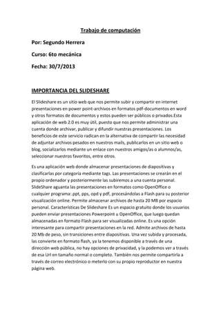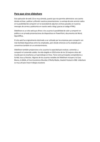 SlideShare es un sitio web que permite a los usuarios subir y compartir presentaciones de diapositivas, documentos de Word y otros formatos de manera pública o privada. Ofrece la ventaja de compartir archivos grandes sin necesidad de adjuntarlos a correos electrónicos o publicarlos en un blog, ya que proporciona un enlace para visualizar el contenido. Además, permite evaluar, comentar y compartir el contenido subido, convirtiéndose en una herramienta útil tanto para empresas como para entretenimiento y educación.