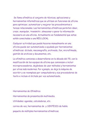 El documento habla sobre la ofimática. Explica que la ofimática se refiere al conjunto de técnicas, aplicaciones y herramientas informáticas utilizadas para optimizar y automatizar tareas de oficina. Describe algunas herramientas comunes de ofimática como procesadores de texto, hojas de cálculo y presentaciones. También menciona que los paquetes ofimáticos más populares son Microsoft Office y OpenOffice, el cual es de código abierto.