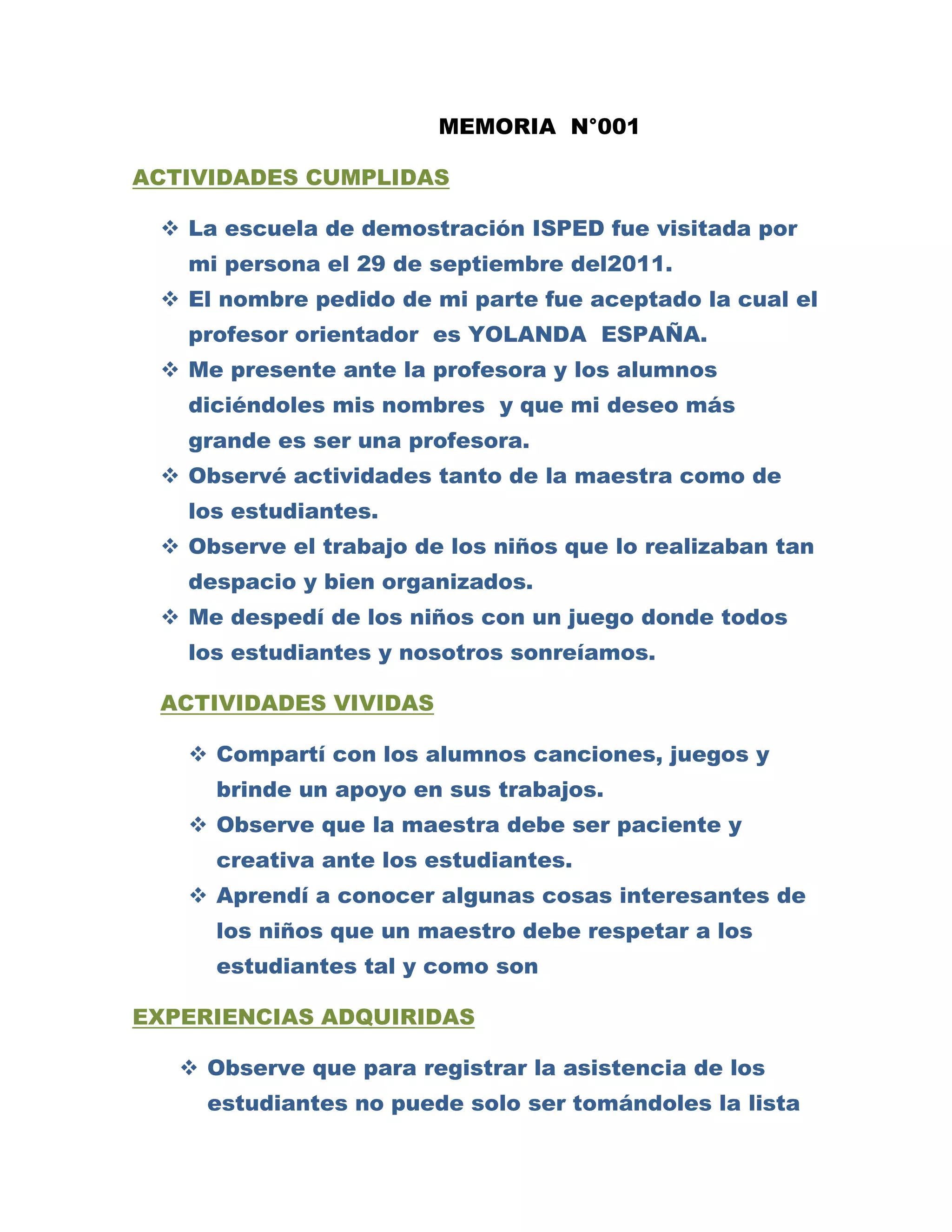 The document describes the activities carried out by a student teacher during their teaching practicum. It details the observations made of the teacher and students, experiences shared with the students like songs and games, and lessons learned about respecting students and making the class engaging. The student teacher concludes that being in front of students is a valuable learning experience.