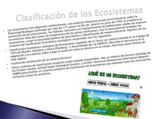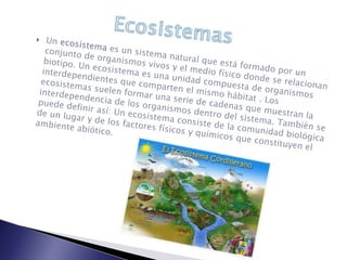 Un bioma es una gran región ecológica definida por factores climáticos y de vegetación como los árboles, arbustos y hierbas. Los biomas se clasifican en terrestres, de agua dulce y marinos. Los ecosistemas acuáticos incluyen océanos, aguas continentales y cuerpos de agua con propiedades físicas particulares. La oceanografía y limnología estudian ecosistemas acuáticos fóticos y afóticos. Los ecosistemas terrestres dependen