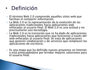 La Web 2.0 se refiere a sitios web que facilitan el compartir y la colaboración de información entre usuarios. Representa la evolución de aplicaciones tradicionales a aplicaciones enfocadas en el usuario final como blogs, wikis y redes sociales que permiten publicar y acceder fácilmente a contenidos.