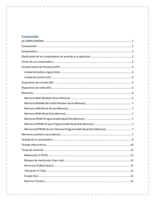 Este documento describe las partes principales de una computadora. Explica que una computadora está compuesta por una unidad central de procesos, dispositivos de entrada y salida, memorias, y un teclado. El teclado contiene teclas alfanuméricas, de edición, numéricas y de funciones que permiten introducir datos e instrucciones a la computadora.