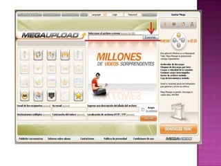 Este documento proporciona instrucciones en 3 pasos para subir archivos al sitio web Megaupload: 1) Ir a www.megaupload.com y hacer clic en "explorar"; 2) Seleccionar el archivo a subir y hacer clic en "enviar"; 3) Esperar a que termine de subir el archivo y obtener la página para descargarlo. También describe las restricciones de la cuenta gratuita de Megaupload, como un límite de 1 GB y 25 kb por día.