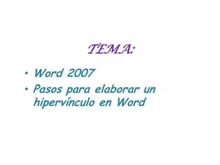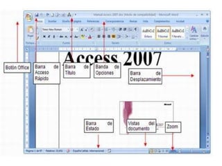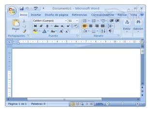 Este documento proporciona instrucciones sobre cómo usar Word 2007, incluyendo cómo iniciar el programa, escribir texto, usar la barra de herramientas y pestañas, y revisar la ortografía y gramática. Explica las funciones básicas de Word 2007 como guardar archivos, deshacer cambios, y corregir errores ortográficos mientras se escribe.
