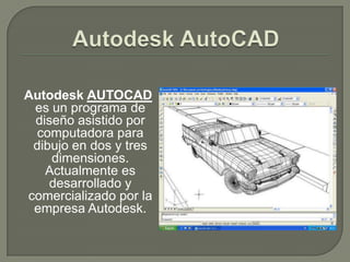 AutoCAD es un software de diseño asistido por computadora (CAD) desarrollado por Autodesk para dibujo 2D y modelado 3D. Comenzó en 1982 y ha evolucionado a través de las décadas para mantenerse relevante, adoptando nuevas características, formatos y plataformas. A lo largo de su historia, Autodesk adquirió otros programas CAD para ampliar su oferta y competir en más mercados.