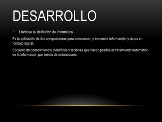 Este documento proporciona definiciones de términos clave de informática como hardware, software, Bluetooth, multimedia y USB. También describe dispositivos de entrada y salida como mouse, audífonos, impresora y monitor. Además, menciona formas de almacenamiento como flash memory y disco duro. Por último, discute la importancia de tener una contraseña en una red Wi-Fi.