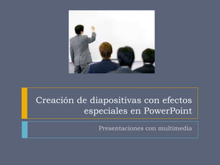 Este documento describe cómo insertar diferentes elementos multimedia en presentaciones de PowerPoint, incluyendo texto, imágenes, gráficos, diagramas, elementos de audio y video, y animaciones. Explica cómo agregar estos elementos y personalizar las animaciones para crear presentaciones interactivas con efectos especiales.