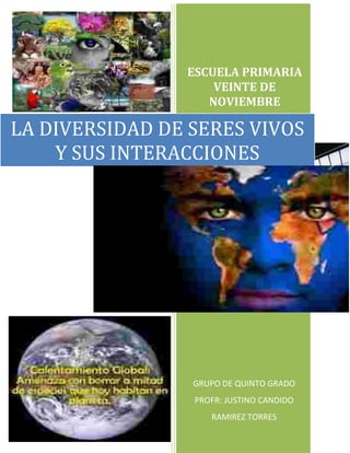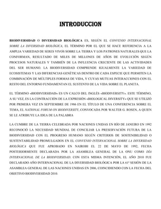 El documento presenta una introducción a la biodiversidad o diversidad biológica, definiéndola como la amplia variedad de seres vivos y ecosistemas en la Tierra. Explica que la biodiversidad es el resultado de miles de millones de años de evolución y ha sido influenciada por las actividades humanas. Además, provee una definición más detallada de los tres niveles de biodiversidad (genética, de especies y ecosistémica) y discute brevemente la importancia de preservar la biodiversidad por sus beneficios