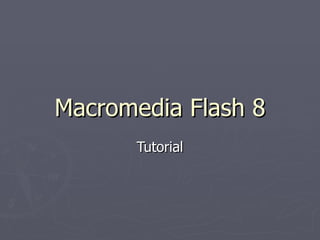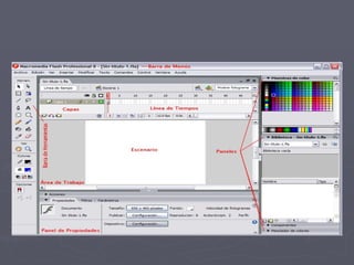 Flash 8 es una potente herramienta creada por Macromedia para realizar animaciones y GIFs animados para la web de forma sencilla y rápida. Cuenta con un entorno de trabajo intuitivo similar a otros programas de Macromedia. Permite dibujar, colorear y trabajar con textos, capas y sonidos para crear animaciones interactivas.