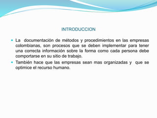 La documentación de métodos y procedimientos en las empresas colombianas es importante para tener una correcta información sobre cómo cada persona debe comportarse en su trabajo y para que las empresas sean más organizadas y optimicen los recursos humanos. Implementar estos métodos y procedimientos hace que las empresas colombianas definan mejor las funciones específicas en cada puesto de trabajo y se refleje en mayor orden y rentabilidad. Además, da garantías tanto al trabajador como al empleador de que el trabajo se basa en los lineamientos recomendados.