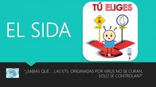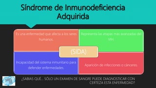 El documento proporciona información sobre el SIDA/VIH, incluyendo su origen, síntomas, diagnóstico, prevención y estadísticas. El SIDA es la etapa más avanzada de la infección por VIH y debilita el sistema inmunológico, dejando al cuerpo vulnerable a infecciones. Se originó en África al pasar de simios a humanos y ahora afecta a millones de personas en todo el mundo. La detección temprana y el uso de condones u otras medidas de prevención son cruciales para controlar