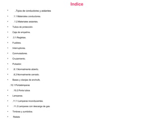 Este documento describe diferentes componentes eléctricos, incluyendo materiales conductores e aislantes, tubos de protección, cajas de empalme, regletas, fusibles, interruptores, conmutadores, pulsadores, bases y clavijas de enchufes, lámparas, timbres, y relés. Explica la función de cada componente y cómo permiten o interrumpen el flujo de corriente eléctrica a través de un circuito.