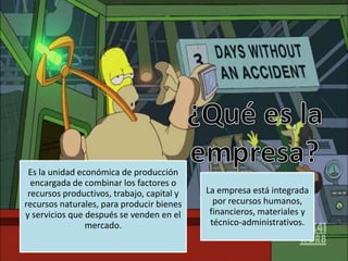 La empresa es la unidad económica que combina recursos productivos para generar bienes y servicios. Está compuesta por diversas áreas funcionales, incluyendo mercadotecnia, finanzas, recursos humanos y producción. Los líderes empresariales son innovadores y motivadores, con características como iniciativa, comunicación y una disposición para asumir riesgos.