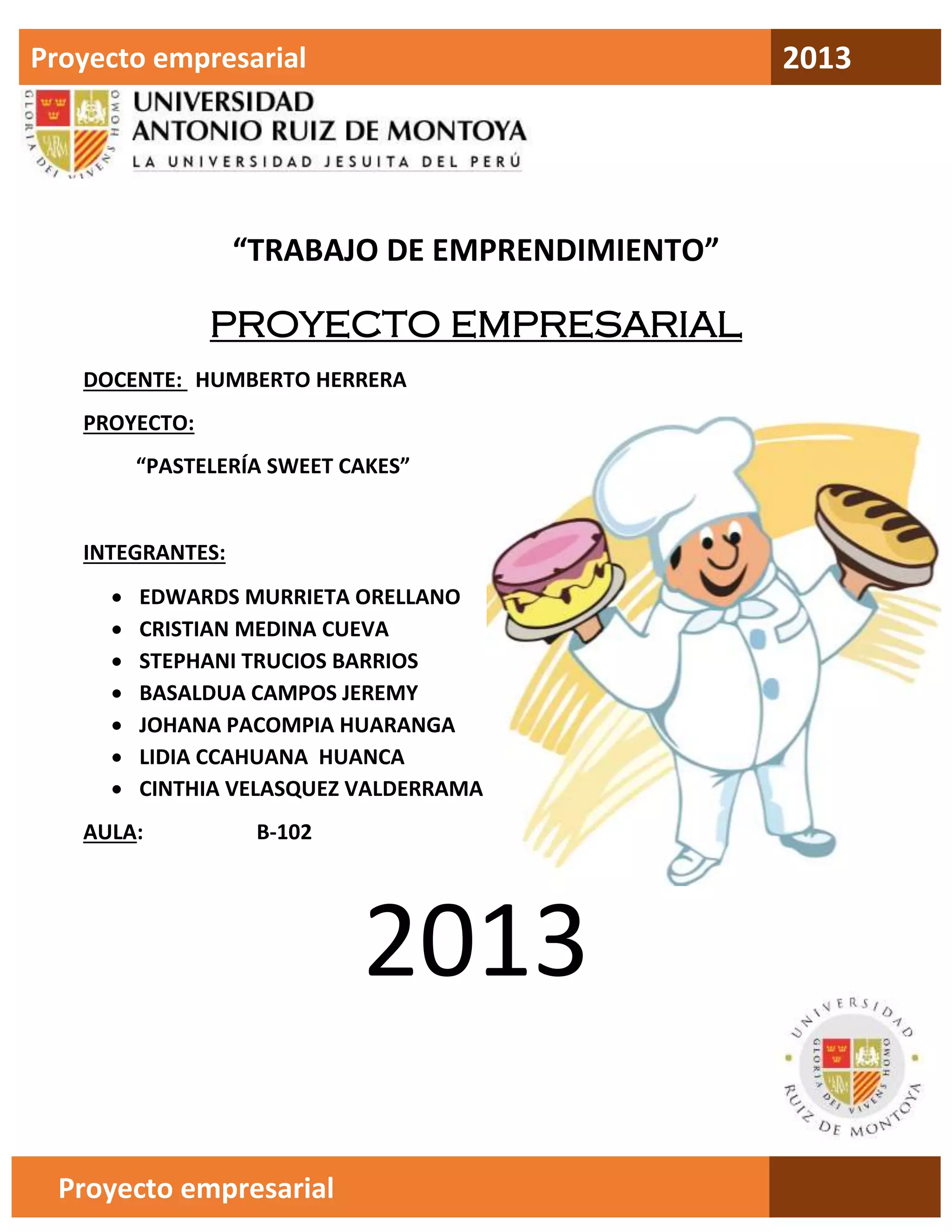 El documento presenta un proyecto empresarial para una pastelería llamada "Sweet Cakes" propuesto por 7 estudiantes. El proyecto describe la idea, visión, misión y objetivos de la pastelería, así como un análisis FODA, ubicación, tamaño de planta, entorno, flujo de caja y procesos. El proyecto busca establecer una pastelería que ofrezca productos de alta calidad a bajo precio.