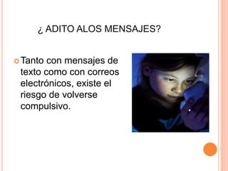 Este documento discute la adicción a los mensajes de texto y correos electrónicos. Explica que muchas personas no se dan cuenta que son adictas y que esto puede causar problemas mentales y físicos. También describe los síntomas de la adicción como ansiedad por no recibir respuestas rápidas y desesperación por likes o respuestas. Finalmente, resume pasos para superar la adicción propuestos por un sitio de noticias.