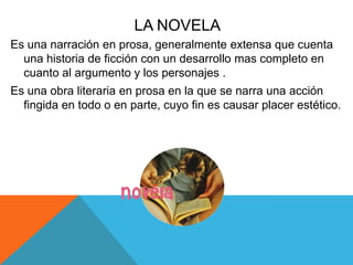 El documento proporciona información sobre varios géneros literarios como la novela, el diario, la crónica, la biografía, la noticia, la historieta y el chiste. Define cada género y describe sus elementos y partes características. También incluye ejemplos para clarificar cada concepto.