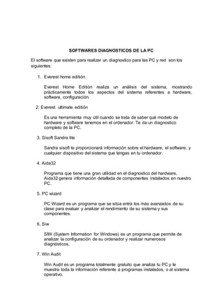 El documento describe varios softwares de diagnóstico para PC, incluyendo Everest, Sisoft Sandra, Aida32, y PC Wizard, que proveen información detallada sobre el hardware, software y configuración del sistema. Otros programas mencionados monitorean el rendimiento, uso de recursos, temperatura del CPU, y la integridad de discos y memoria RAM. En general, el documento lista y brinda una breve descripción de 24 herramientas de software útiles para diagnosticar el estado y funcionamiento de una computadora.