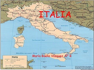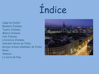 Italia es una república ubicada en la península itálica y en las islas de Sicilia y Cerdeña. Algunas características culturales notables de Italia incluyen su bandera tricolor, su destacada tradición en teatro, música y cine, y su variedad de comidas regionales como la pizza y la pasta. Algunos de los lugares más famosos de Italia son Roma, Venecia y la Torre Inclinada de Pisa.