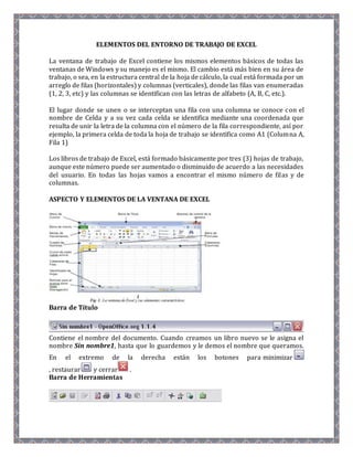 El documento presenta información sobre los elementos de la ventana de trabajo de Excel, incluyendo la barra de título, barra de herramientas, cinta de opciones, barra de fórmulas y barra de estado. También describe cómo cambiar el nombre de las hojas, insertar y eliminar celdas, filas y columnas, y los diferentes formatos de celda disponibles en Excel. Finalmente, explica los diferentes tipos de operadores como aritméticos, de comparación, de texto y de referencia que se pueden usar en Excel.