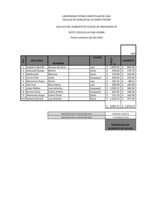 Este documento resume el cálculo del aumento salarial del 30% para 10 empleados de un hotel en Loja, Ecuador. Se lista el nombre, ciudad, sueldo original y aumento de cada empleado, así como el nuevo sueldo total. El empleado con el sueldo más alto es Narcisa de Jesús Zapatero Murillo con $3,640, y el más bajo es Gloria Altamirano Rojas con $383.96. El porcentaje general de aumento de sueldo fue del 30%.