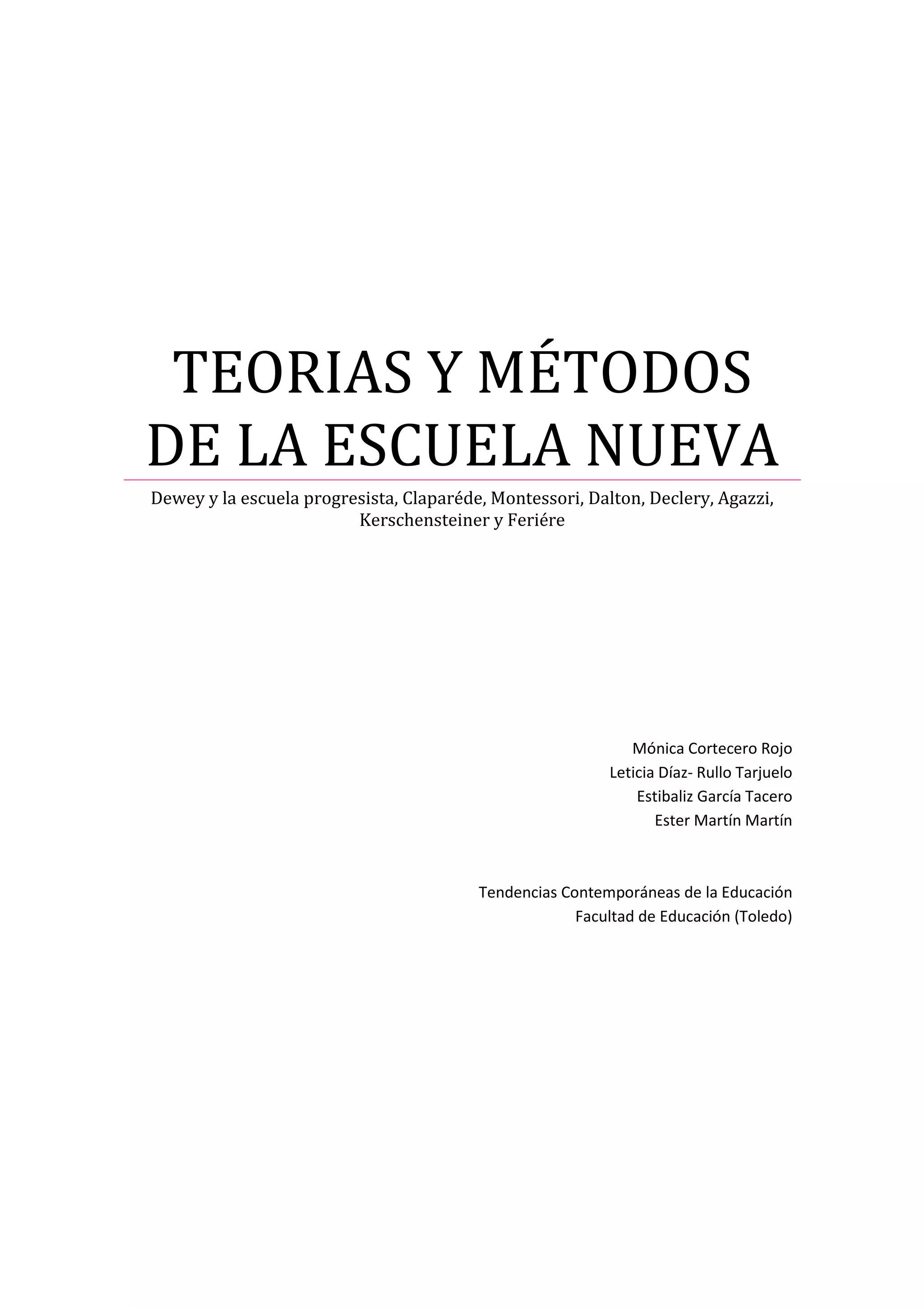 Este documento describe la Escuela Nueva, un movimiento educativo que surgió a finales del siglo XIX. Resume las teorías y métodos de varios pensadores clave como Claparéde, Montessori, Dalton y otros. También explica el contexto histórico en el que surgió la Escuela Nueva y sus principios fundamentales como centrarse en el niño y utilizar métodos activos de enseñanza.