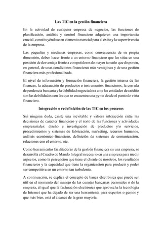 El documento describe el uso de las tecnologías de la información y la comunicación (TIC) en la gestión financiera de las pequeñas y medianas empresas (pymes). Explica que las pymes se enfrentan a desventajas financieras en comparación con empresas más grandes y que las TIC como la banca electrónica y la facturación electrónica pueden ayudar a superar estas desventajas. También describe el Cuadro de Mando Integral como una herramienta de gestión que integra indicadores financieros y no financieros para medir el desempe