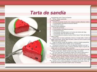 Este documento contiene recetas de cocina en español. Incluye instrucciones detalladas para preparar tarta de sandía, galletas con miel, zumo verde de kiwi y filetes de pollo al limón. Cada receta lista los ingredientes necesarios y describe los pasos para hacerla.